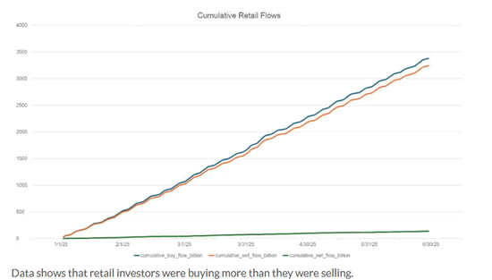 纳斯达克数据显示,2025年1-6月散户累计买入约3.4万亿美元股票,卖出3.2万亿美元,总交易额达6.6万亿美元。这表明,尽管今年上半年市场波动很大,但投资者还是强烈倾向于买入市场,而不是撤资。