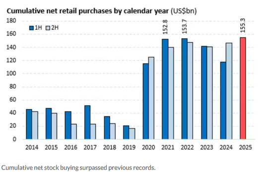 资本市场研究公司Vanda Research的数据略有差异,但趋势一致——该机构发现同期散户净买入1553亿美元个股与ETF,创下2014年有记录以来最高净流入,超过2021年上半年1528亿美元的前高(当时散户借迷因股热潮与疫情刺激支票涌入市场)。
